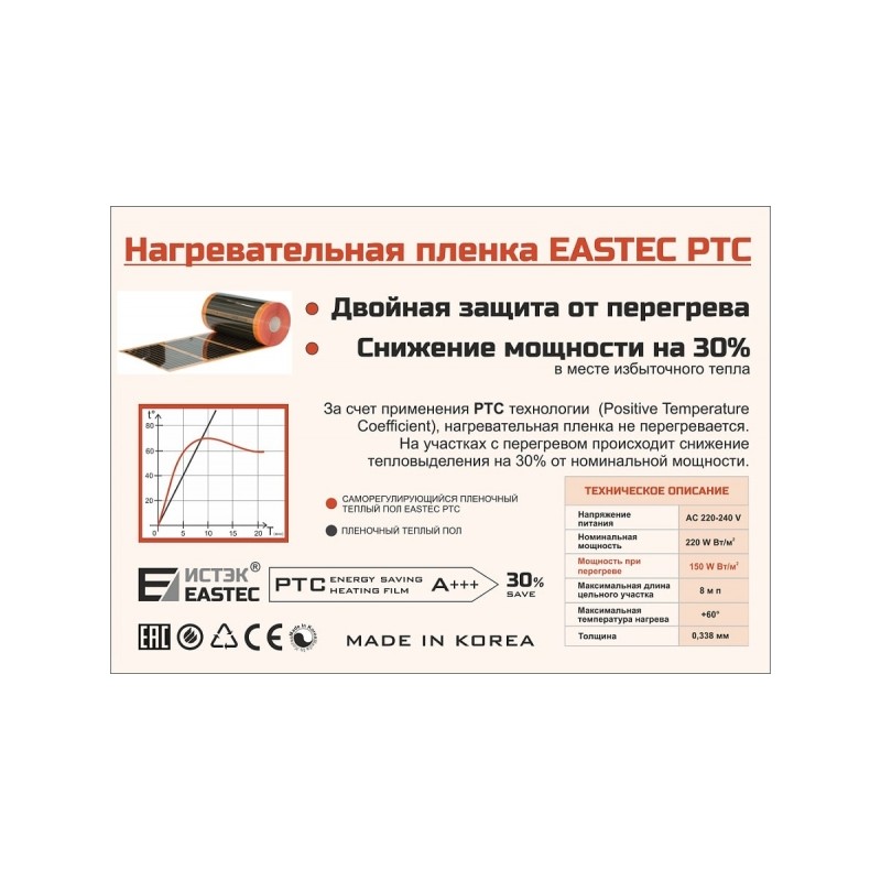 Инфракрасная саморегулирующаяся термопленка EASTEC Energy Save PTC шириной 100 см – уникальный инновационный пленочный нагреватель 4-го поколения. Изготавливается в Южной Корее на заводе Green Industry Co, крупнейшем производителе бытовых и промышленных пленочных нагревателей.