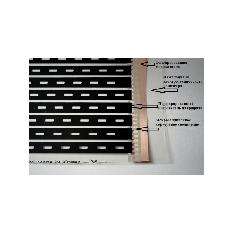 Термопленка EASTEC 50см*0,338мм*100м, Ю.Корея. - это продукт 3-го технологического поколения, состоит из перфорированных графитовых полос, заламинированных с двух сторон электротехническим полиэстром. Перфорированные графитовые полосы нагреваются за счет подачи электричества от медных шин, протянутых вдоль всей полосы. Медные шины соединяются с графитом при помощи антиискровой серебряной пасты.
