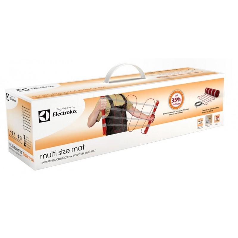 Electrolux Multi Size Mat – сверхтонкий нагревательный мат на эластичной основе. Уникальная растягивающаяся конструкция позволяет изменять длину мата в диапазоне от 10% до 35% от первоначальной, тем самым варьируя площадь обогрева и мощность мата от 150 Вт/м² до 111 Вт/м². Укладывается под любые напольные покрытия, в том числе деревянные.