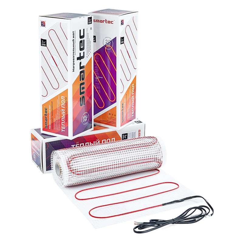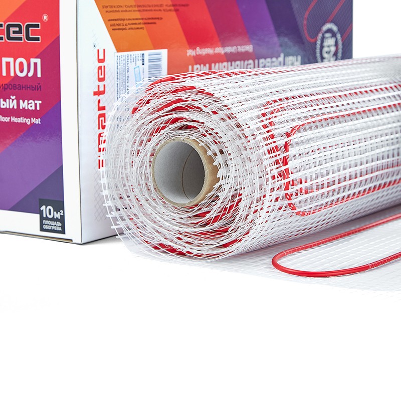 Нагревательные маты Smartec представляют собой тонкий двухжильный нагревательный кабель, пришитый к специальной щелочестойкой сетке из стекловолокна шириной 50см. Длина нагревательных матов в зависимости от площади обогрева варьируется от 1м до 20м. Нагревательные маты просты в укладке и используются в случаях, когда нет возможности поднять уровень пола. Нагревательные маты Smartec укладываются на этапе отделочных работ непосредственно в слой плиточного клея, самовыравнивающийся раствор либо тонкую стяжку непосредственно под покрытие пола. Небольшая толщина нагревательного кабеля (около 4мм) позволяет использовать минимальную толщину плиточного клея. В качестве покрытия рекомендуется использовать керамическую плитку, керамогранит, мрамор. При монтаже сетка нагревательного мата аккуратно разрезается и разворачивается в нужном направлении.