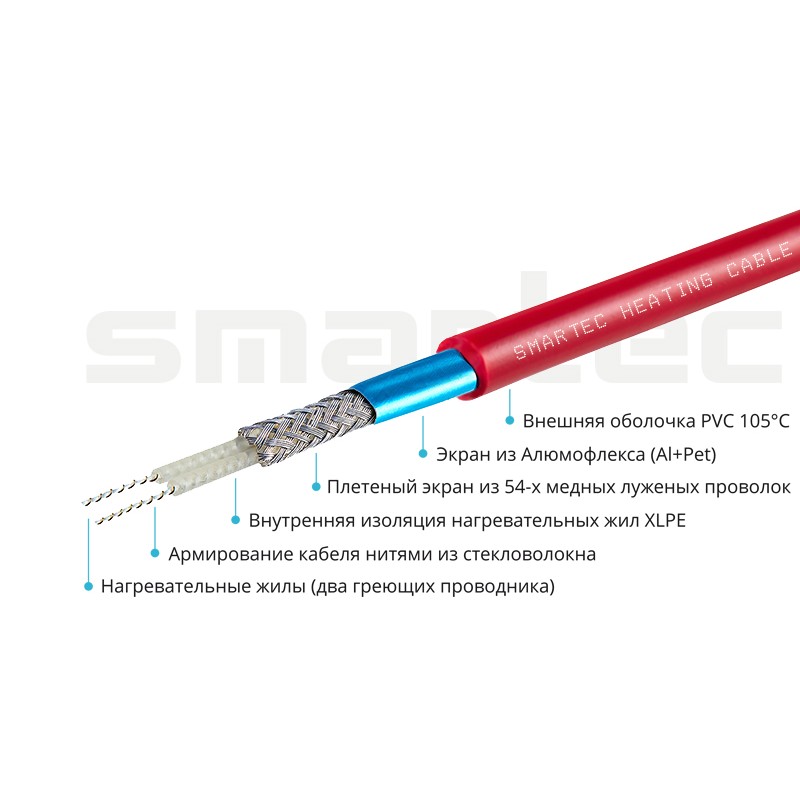 В нагревательных матах Smartec используется высококачественный двухжильный нагревательный кабель удельной мощностью 15Вт/м в высокотемпературной изоляции с внешней оболочкой круглого сечения. Две нагревательные жилы кабеля позволяют снизить температуру отдельной жилы, более равномерно распределяя выделяемое нагревательным кабелем тепло, увеличивают надежность и долговечность нагревательного кабеля, обеспечивают его устойчивость к перегреву. Для подключения к сети питания нагревательный мат имеет холодный провод длиной 2,5м.