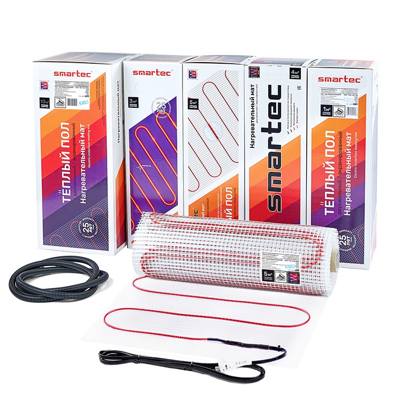 В нагревательных матах Smartec используется высококачественный двухжильный нагревательный кабель удельной мощностью 15Вт/м в высокотемпературной изоляции с внешней оболочкой круглого сечения. Две нагревательные жилы кабеля позволяют снизить температуру отдельной жилы, более равномерно распределяя выделяемое нагревательным кабелем тепло, увеличивают надежность и долговечность нагревательного кабеля, обеспечивают его устойчивость к перегреву. Для подключения к сети питания нагревательный мат имеет холодный провод длиной 2,5м.