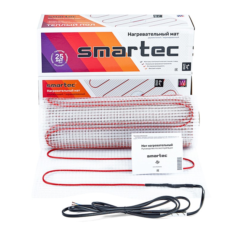 Нагревательные маты Smartec представляют собой тонкий двухжильный нагревательный кабель, пришитый к специальной щелочестойкой сетке из стекловолокна шириной 50см. Длина нагревательных матов в зависимости от площади обогрева варьируется от 1м до 20м. Нагревательные маты просты в укладке и используются в случаях, когда нет возможности поднять уровень пола. Нагревательные маты Smartec укладываются на этапе отделочных работ непосредственно в слой плиточного клея, самовыравнивающийся раствор либо тонкую стяжку непосредственно под покрытие пола. Небольшая толщина нагревательного кабеля (около 4мм) позволяет использовать минимальную толщину плиточного клея. В качестве покрытия рекомендуется использовать керамическую плитку, керамогранит, мрамор. При монтаже сетка нагревательного мата аккуратно разрезается и разворачивается в нужном направлении.